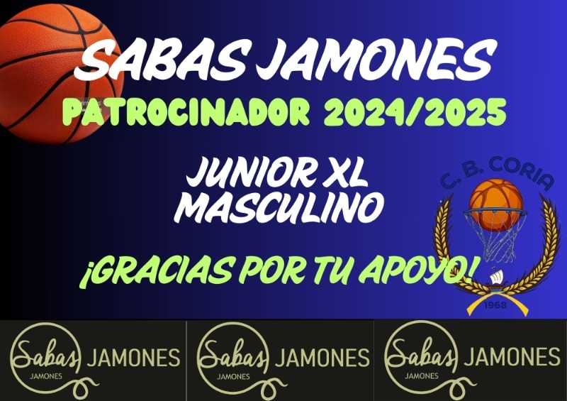 Tenemos el orgullo y la alegría de anunciar que SABAS JAMONES volverá a patrocinador un equipo esta temporada 2024/2025. El Junior XL Masculino. Que se denominará esta temporada SABAS JAMONES CB CORIA XL. 👏👏 Además su logotipo se unirá a la camiseta de dicho equipo. 😮👌